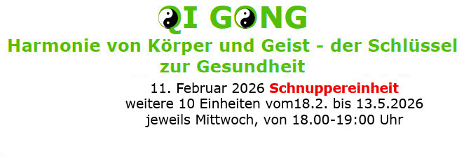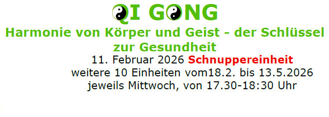 Die Lehre des Qi Gong zeigt uns Wege, unsere Körperenergie zu fühlen und zu lenken, um das innere Gleichgewicht zu finden, Blockaden zu lösen und den Energiefluss zu erhöhen. Qi Gong steigert die Lebenskraft, stärkt das Immunsystem, die innere Muskulatur und harmonisiert Körper, Geist und Seele.